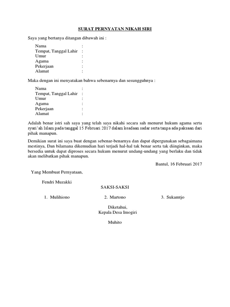 Dalam halaman ini juga ditandatanganilah buku nikah oleh petugas pencatat. Karena disini, pasangan nikah tak mendapat surat nikah legal dari negara. Contoh surat pernyataan nikah siri. Contoh surat nikah siri kosong doylc asia. Contoh surat cerai nikah siri ilmusosial id.